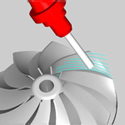 前工程までの加工完了形状を次加工の素材形状として認識でき、エアカットの無い効率的なパスを作成できます。また複数の工程でスケジュールを組むこともでき、加工ノウハウの蓄積に役立ちます。 - インペラー加工