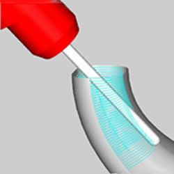 複雑に変化する曲面や曲面間のフィレット等の加工を、一定の工具当たり角度を保って滑らかに加工することで、美しい仕上がり面が得られます。またこれにより工具への負荷も最小化されるため、刃物面が健常に保持され、長寿命化が図れます。