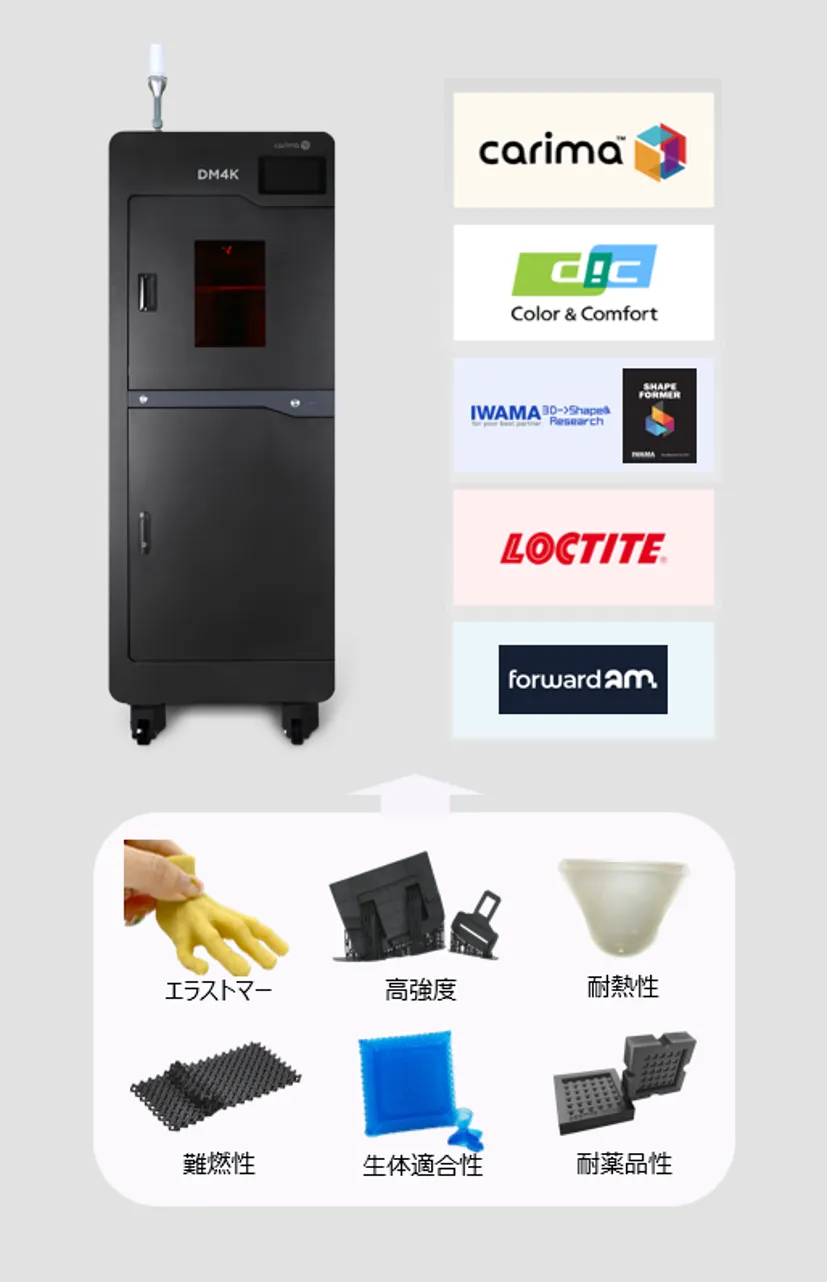 CARIMA DM4Kは特許技術テンションフリーフィルムとオープンマテリアルシステムを採用し、高精細な表現と高い再現性をもたらします。要求が厳しいデジタル製造環境に高い生産性を提供する、幅広い用途で活用できる3Dプリンタです。
